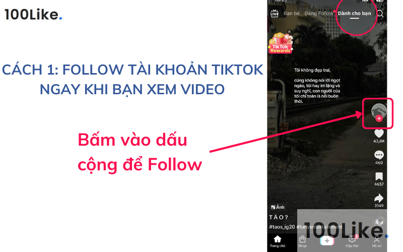 Ngay tại trang chủ của ứng dụng, bạn bấm chọn vào phần “Dành cho bạn”. Khi bạn lướt các video nằm trong phần “Dành cho bạn” (phần này có nghĩa là Tiktok tự đề xuất cho người xem, chứ bạn chưa Follow). Trong quá trình xem, nếu video nào có nội dung hoặc chủ đề mà bạn yêu thích và bạn muốn Follow tài khoản này. Bạn hãy bấm ngay vào biểu tượng dấu cộng màu đỏ (+), nằm phía dưới avatar tài khoản, góc bên phải màn hình.
